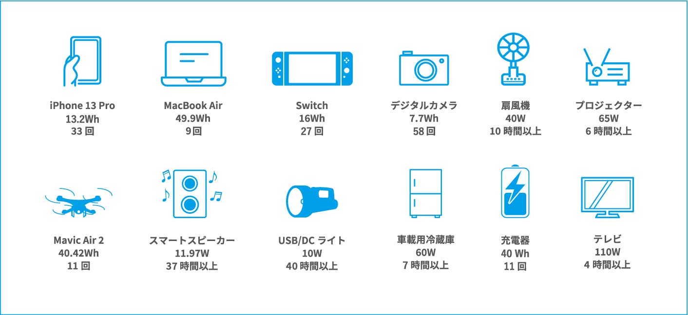 携帯充電・テレビ・ラジオ・照明・冷蔵庫など多くの家電にご利用いただくことが可能です。